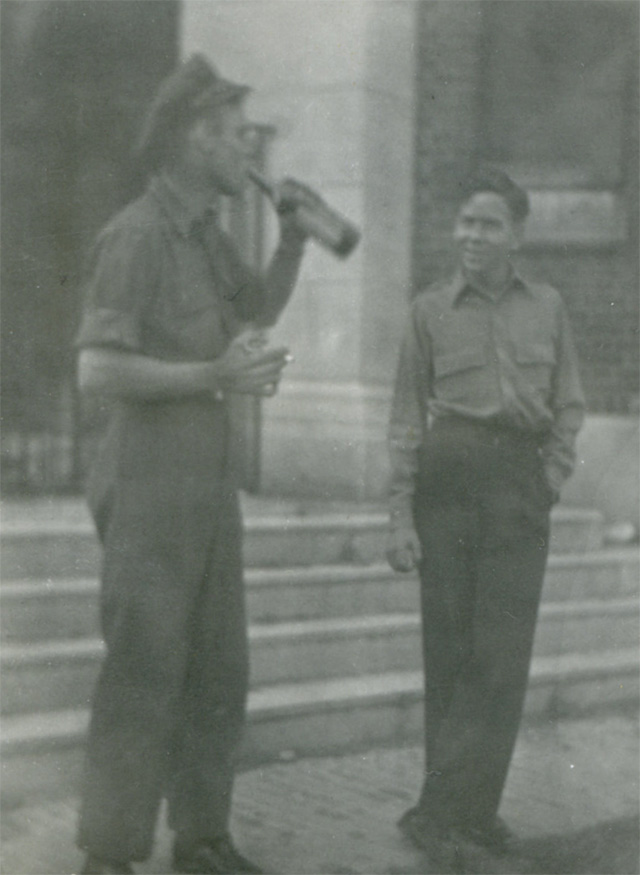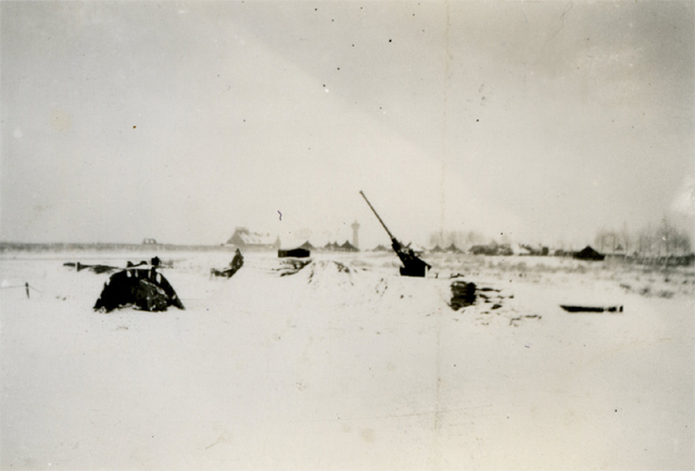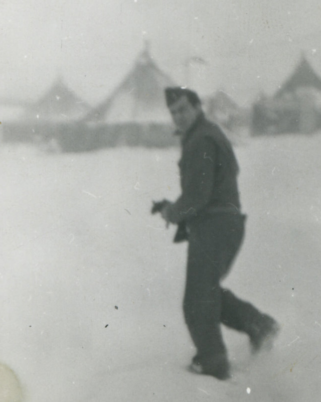 T/Sgt. Harold E. Schweighart "Barber Shop in background built by the fellows"