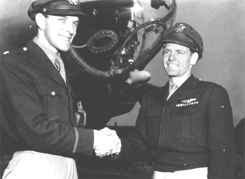 Capt. Rollin D. Childress, 911 So. Ohio Ave., Etowah, Tenn., is congratulated by Lt. General Lewis H. Brereton, Commanding General of the 9th Air force, who presented him with the Silver Star in ceremonies at a Martin B-26 base in the ETO. France.